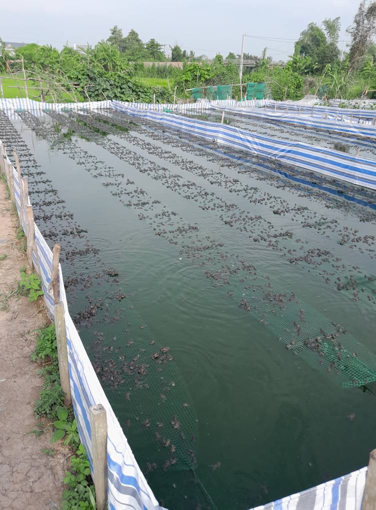 – Bước 6 : xả nước, rửa sạch hồ,bơm nước vào chừng 25cm , bỏ tấm nhựa và cho ếch vào nuôi với mật độ 80con/m2. Lưu ý: ban đầu mới thả ếch còn nhỏ nên ta thả mật độ dày hơn để ếch ăn nhiều ( 200con/m2).