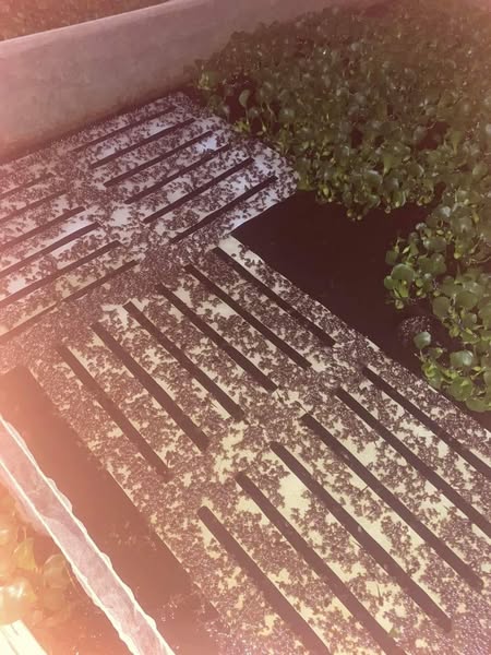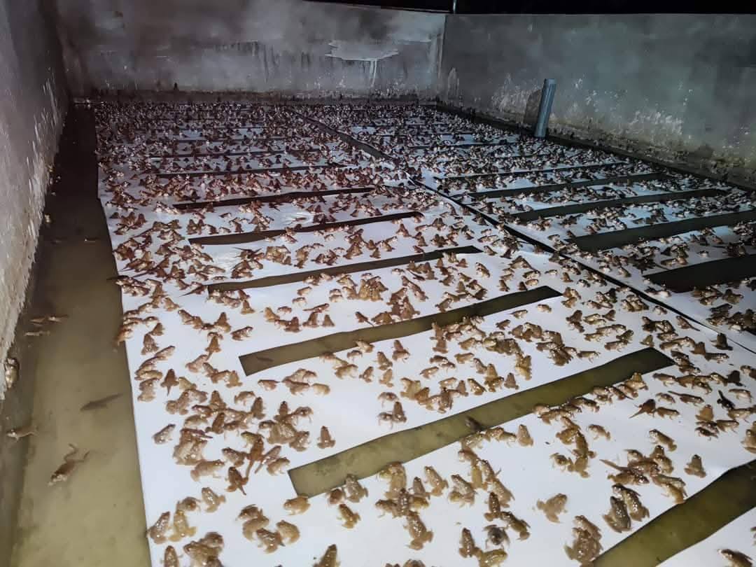- Thả giống và cho ếch ăn : sau khi xử lý xong bể bạt và có giá thể cho ếch ngồi , lợp mái che nắng đầy đủ… bà con tiến hành thả giống. Với bể xi măng bà con thả với mật độ 80 con/ m2, mức nước 50 cm. Bà con thả vào sáng sớm hoạc chiều tối. Sau khi ếch đã leo lên vỉ giá thể khoảng 2 tiếng bà con tiến hành cho ăn.